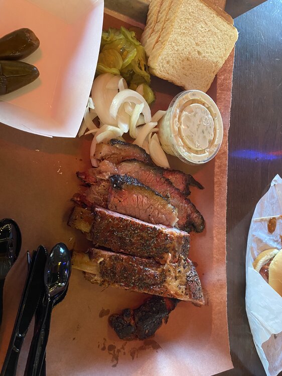 Hays County BBQ yesterday. Excellent cue. Brisket off the fat end, 2 pork ribs and the knife on the block guy threw on the burnt ends after meat was taken off the scale (I can’t help it if people like me, my magnetic, charming personality and good looks). Plain white onion and common pickle chips were on point. Creamy tater salad was good. No tortillas. Bottled beer. Big Red soda water on tap.6 points