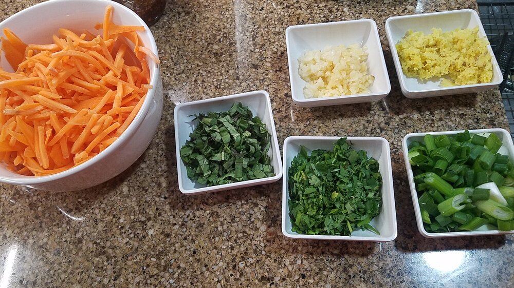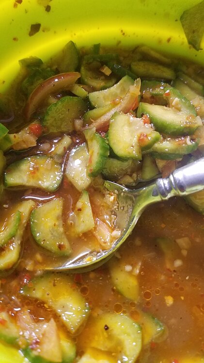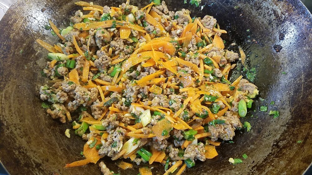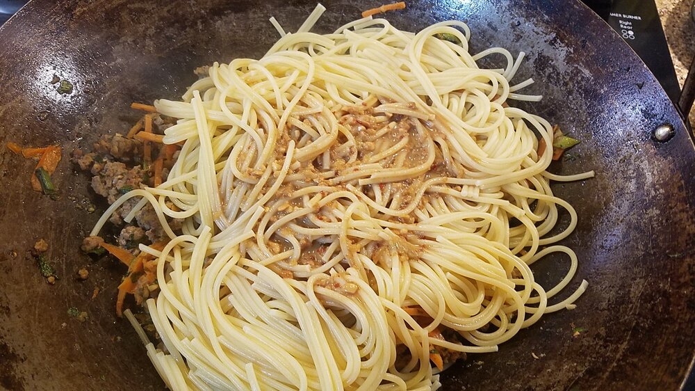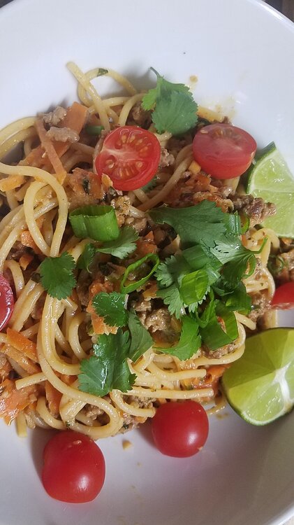 ^hell yes! so if i had a 'signature dish' it would probably be this...Thai pork noodles with peanut sauce. shredded carrot, green onion, cilantro, Thai basil, grated ginger and garlic, and chili sauce. added to ground pork (browned with chili oil): add mostly cooked noodles and peanut sauce: garnished with more cilantro and green onion, tomato, and lime: served with some TJ gyoza dumplings...and i had a little of this cucumber kimchi i made, which went great as a little bite of acid here and there 😊7 points