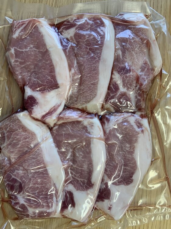 Ok, posting pre-shit I’ve cooked. I got a tip on raw Mangalica loin chops, which are hard to get here. Most of it is imported as sausage or bacon. This is the Cadillac of pork, from a Hungarian curly haired breed that is slaughtered late, raised with care, and produces crazy marbled meat. Take a look at these loin chops, the marbling is on par with what you see in prime beef. I am thinking a pan sear and some simple sides. Will update.9 points