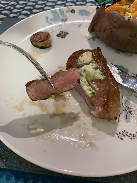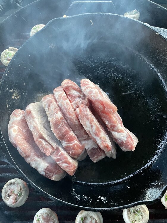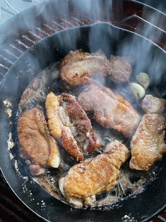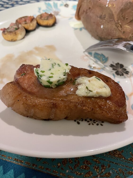 Revisiting the Mangalica chops. I was inspired by this guy’s video: I did something similar. Simple sear, starting them off in a cold pan over the fire to render the fat. Then seared on each side. Instead of a brown butter sauce, I finished them with a bath of butter, rosemary, and garlic and then added a compound garlic-scallion butter. They were pretty much perfect. Because of the fat and marbling you can and should take them at least to medium. Searing the edge crispy was genius. Sides are unimportant but prosciutto and parmesan stuffed mushrooms and a baked sweet potato.9 points