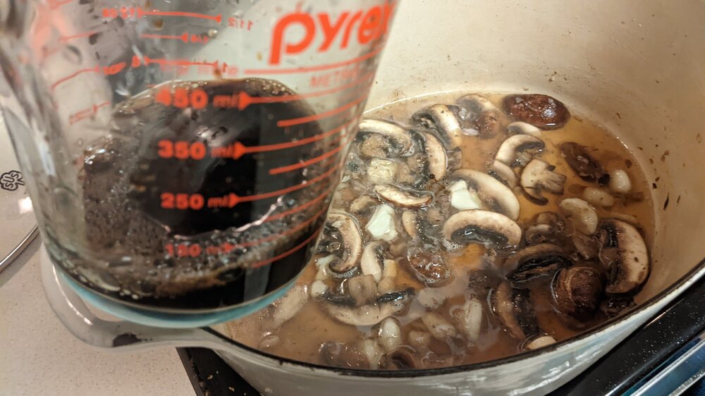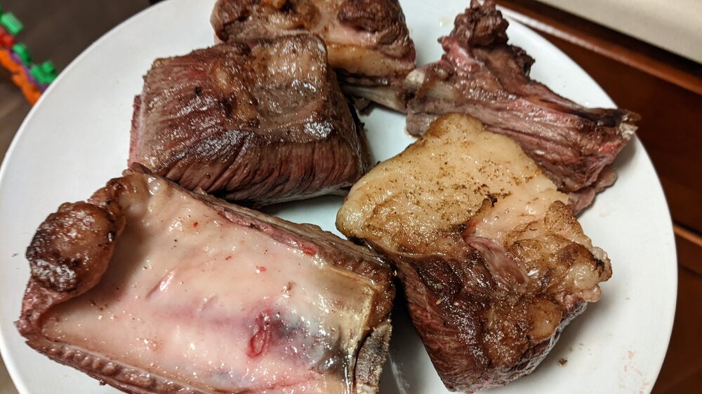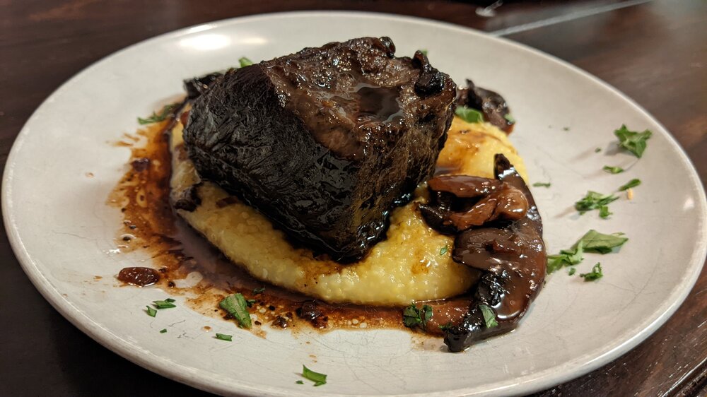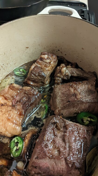 I picked up some short ribs at HEB and thought I'd try a braised short rib version of the filipino style chicken adobo I made recently. Browned the short ribs in a dutch oven, then poured off the excess oil and sauteed shallots and mushrooms and added a bunch of pressed garlic cloves. Let it all sweat a minute or two and added a cup of apple cider vinegar, 2/3 cup of soy sauce, 5-6 oz brown sugar, a handful of bay leaves, and a couple of tablespoons of whole peppercorns. Put the short ribs back into the dutch oven, threw in some fresh jalapenos, brought it to a quick boil and then let it simmer for about an hour and a half. The I made some creamy polenta before the short ribs were done to serve with it. Very rich and decadent dish, nice and tangy from the vinegar and soy sauce. I think next time I might try to add some coconut milk to the braise as well. Really good regardless.8 points