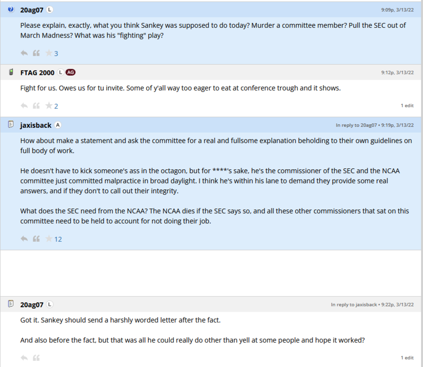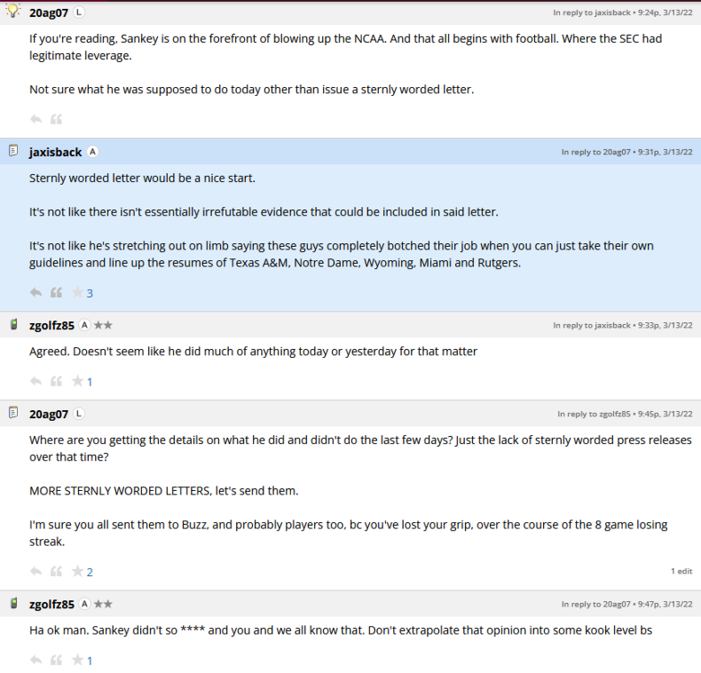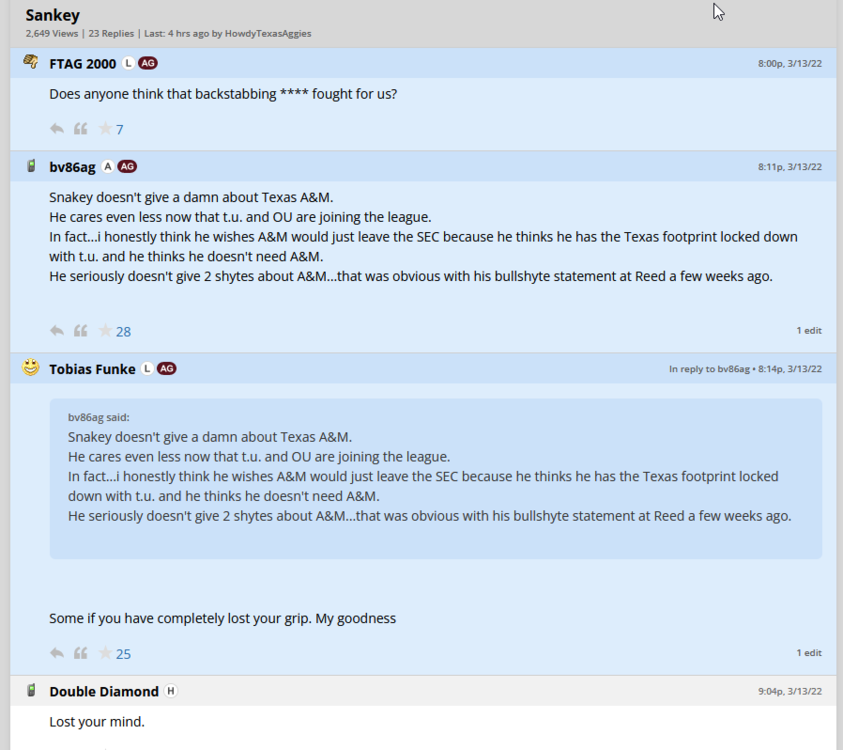 I like this one from an Aggy scholar: cupofjoe04 AG We are out. They don't give a crap how we feel or what we say. There is nothing we can do to force a response from the NCAA, and they would be idiots to give us any sort of a response. It's a loose-loose for everyone.9 points