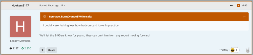 Also: All of you hopeless fuckers trying talk up Hudson Card again are out of your fucking minds. That bitch melted like a bag of Hershey's Kisses tucked into @Wulaw Horn's sex tent. There is no additional context needed for who he is as a QB after witnessing his buttfuckery for an entire season. If you guys think Texas is going into the 2022 season with one of the highest rated recruits of all-time sitting on the bench while they give snaps to a guy that they cannot rely on or trust, then you've had too much to drink this early in the day and it's time for a nap.15 points
