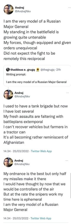 Joke going around A joke from Moscow: "According to Putin the special military operation is really a conflict between Russia and NATO about World dominance. Whats the situation now?" "Russia has lost 15000 troops, 6 generals, 500 tanks, 3 ships, 100 aircraft and 1000 trucks. NATO hasn't arrived yet."13 points