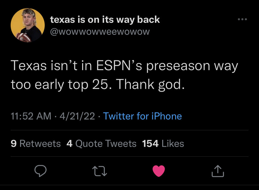 The freshman class at OL for Texas in 2022 will be one of the highest performing groups at OL ever recruited. We will be shocked at how much more effective everything on offense is when Banks is starting at LT and Campbell is either alongside him at LG or on the other side at RG. People are going to shake their heads in disbelief at their lack of faith in what these guys and Flood can get done versus everything that existed before them on the roster.10 points