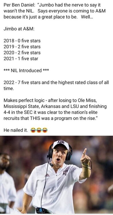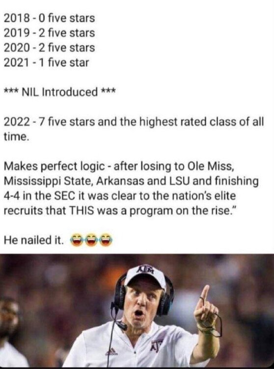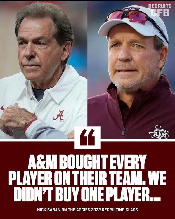 That pc was greatness. Overtly threatening Saban and Bama is an interesting choice, especially when you are provably guilty as fuck. Fisher is crazy enough and aggies are dumb enough to take info from Fisher and go start digging trying to show proof of Saban’s dirtiness. They just might succeed in alienating everyone in college athletics and wind up being forcibly thrown out on their ass from the SEC. They can’t help themselves. Bryce Anderson’s family didn’t take a dime during his recruitment. I will laugh my ass off if Fisher and the aggie PR team try to trot him, and the few other highly ranked guys that they didn’t actually pay, out in front of the cameras to attest to the aggie recruiting sanctity. Those parents all now know that other players’ handlers got paid. You think they want to look like chumps? Hell, Walter Nolan got $750k and that dumbfuck’s family is already trying to renegotiate their deal. This could wind up imploding gloriously. Denver Harris’ mom got $50k the first day he went to class. Evan Stewart wound up with half a million. Aggies would be well advised to shut the fuck up and hide in the shadows after all of that. But, no, they can’t help themselves. They NEED everyone to believe they were clean and above board when, absurdly, they know for fucking certain that they weren’t. Insane.19 points
