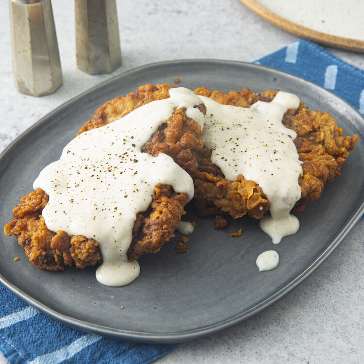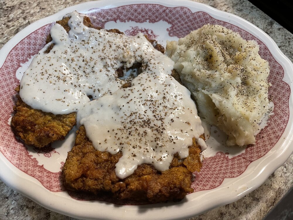Ketchup? Any of you who put ketchup on your CFS have no right to criticize me. Long story time. Feel free to scroll on by if you’re not interested. I’ve seen recipes with a darker gravy, like this one from simplyrecipes.com: I’ve also seen a host of recipes with a white cream gravy. Like this one from foodnetwork.com: Or this one from Allrecipes.com: Or this one from homesicktexan.com: I went with a white gravy because I had this very clean bacon grease. I had that because I had more grease than would fit in my bacon grease jar once so I got a layer that had no bacon bits in it. It was pure. After it solidified in the fridge I scraped most of it it off and kept it separate. I figured the best use for it would be to make a white cream gravy. (My bacon of choice is 365 brand applewood smoked unfurled bacon from Whole Foods.) For a first timer, I don’t think I did too bad. As you can see, I love fresh ground black pepper. Not shown is a side of corn because I figured it needed a side of corn. I should’ve prepared two plates so I could’ve shown the corn because I could only eat half of that. I had leftovers for lunch yesterday. The gravy was tasty. (If you think your gravy is pasty, add more liquid.) I only seasoned one side of the “steaks” (cutlets?) because they’re so thin. That worked well but the gravy by itself could use more salt. But they we’re good together. I should’ve cut the steaks in half and worked with four smaller pieces instead of two big ones. I tried adding a pickle slice to a corner of the steak. Made two bites out of it. If I had a sandwich shop, I would sell a chicken fried steak sandwich, with pickles like on Chick-fil-A, and with cream gravy, because that works. Is that a novel concept or are people already doing that?9 points