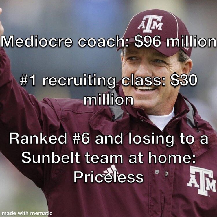 I don't want to put too much on the aggie schedule outcomes over the next 4 weeks, but it is hard not to do so. If ATM shits the bed and goes 1-3 or 0-4 during that run, there is going to be a lot crawfishing coming from the people participating in buying players. They're trying to fuck with Texas on Muhammed. With MM, they're offering something absurd, but it's not clear that they can even get that done. Texas wants MM no matter what, in any event. If ATM is in Year 5 of Ritz Bit and they are sitting at 2-4 and trying to push for recruits, they're not going to have as much firepower behind them. To say that the money this cycle is being reluctant would be an understatement. Also, the word is that they're more interested in seeing Hale not go to Texas than they are in having him sign with them. I mean, in any other setting, I would say that sounds like pure bullshit. Of course, this is not any other setting. Wait, so you think Bama looking like shit at WR is a good thing in recruiting Hale? I don't see that. Sarkisian and Marion have everything they need in order to sell Texas to recruits, Hale included.15 points
