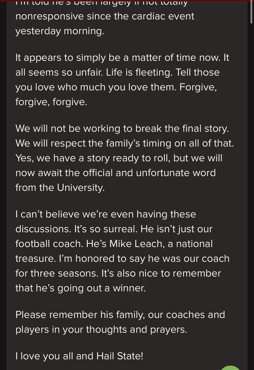 This is fucking sad. I’ve always respected Coach Leach for what he has achieved on and off the field; his willingness to speak his mind; his aversion to what everybody else would deem “normal” for a man in his profession; and most of all his ability to keep opposing players, coaches, and fans on pins and needles when facing his team. He got an extremely bad rap at Tech, and they have been paying for it ever since. I was relieved when he left the big 12 conference because he was the only coach I actually feared; precisely due to the unpredictable nature of his teams and their ability to play up to their competition. There was no variance with Stoops. If you didn’t have supreme talent and a killer instinct, he would embarrass you. Snyder’s teams were going to be disciplined, and if you fucked around on special teams, they would beat you. Gundy’s the same every year—if you have the talent and discipline to outlast him, you will win. Kinda the same with Campbell. With Leach, you never fucking knew because you could be up by three scores and be miserable. If they got a lead, you’d be miserable because they could score at will and you might not get a chance to come back. You had to defend for four downs and for four quarters. It was constant unease. Mike Leach made me a Chance Mock fan for life. Mike Leach made a lot of people Blake Gideon haters for life. On paper, neither one of those games should have been close enough for those players to have made a difference. Mike Leach made college football fun and populated college football with more of his disciples than many coaches with better records and more trophies. His coaching tree almost seemed to be born out of the need to defeat Hayden Fry’s coaching tree, and they largely did in time. Most of all, Mike Leach knew how to humiliate aggies in ways that exposed their deepest insecurities. Here was an intellectual; who never played college football; whose offense was antithetical to everything aggies thought they knew about football; who thumbed his nose at their pageantry and bullshit traditions; and then beat their asses like a rented mule. I loved him for that. And yet, I am reminded of a little anecdote from last year. I happened to be tuned into the post game presser (I tuned into a lot of his presser bc they were often gold) after his team beat a&m yet again in Kyle, and during questioning, a voice seemed to interrupt the proceeding out of nowhere. All of a sudden, Leach’s face lit up as he realized the voice was a former Aggie coach, either Gene Stallings or RC, I can’t remember which, complimenting him on how well his team played that day. He stopped the whole presser to have a brief conversation with him in front of everybody. Leach was genuine and gracious, and it correlated with what I had heard other coaches relay about the type of guy he was off the field. The man is an absolute treasure and I sincerely hope he pulls through this because college football is so much better with him in it. Godspeed, coach.40 points