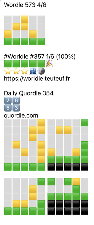 Wordle 573 4/6 ⬛🟨⬛⬛⬛ ⬛⬛🟨⬛⬛ ⬛⬛🟨🟨⬛ 🟩🟩🟩🟩🟩 Daily Quordle 354 5️⃣3️⃣ 4️⃣7️⃣ quordle.com 🟩⬜🟨⬜⬜ ⬜⬜⬜🟨🟨 ⬜🟩⬜⬜⬜ 🟨🟨⬜⬜⬜ ⬜⬜⬜⬜🟨 🟩🟩🟩🟩🟩 ⬜⬜🟨⬜🟨 ⬛⬛⬛⬛⬛ 🟩🟩🟩🟩🟩 ⬛⬛⬛⬛⬛ 🟨⬜⬜⬜⬜ 🟨🟨⬜⬜⬜ 🟩🟨⬜⬜⬜ ⬜⬜⬜🟨🟨 🟨⬜⬜🟨🟩 ⬜⬜⬜⬜⬜ 🟩🟩🟩🟩🟩 ⬜⬜🟨⬜⬜ ⬛⬛⬛⬛⬛ 🟨⬜⬜⬜⬜ ⬛⬛⬛⬛⬛ 🟩🟩🟩🟩⬜ ⬛⬛⬛⬛⬛ 🟩🟩🟩🟩🟩7 points