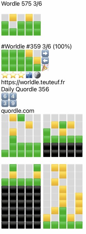 So close to getting it in two. Wordle 575 3/6* β¬π¨β¬π¨β¬ π©π©β¬π©π© π©π©π©π©π© Daily Quordle 356 3οΈβ£4οΈβ£ 5οΈβ£8οΈβ£ quordle.com β¬β¬π©β¬π¨ β¬β¬β¬π©π¨ π©π¨β¬β¬β¬ β¬β¬π©π¨β¬ π©π©π©π©π© β¬π©β¬β¬β¬ β¬β¬β¬β¬β¬ π©π©π©π©π© β¬β¬β¬π¨β¬ β¬β¬π¨β¬β¬ β¬π©β¬β¬π© β¬π¨π¨β¬β¬ β¬β¬β¬β¬π¨ β¬β¬π¨β¬π¨ π©β¬β¬π¨β¬ β¬β¬π¨β¬β¬ π©π©π©π©π© β¬π¨β¬β¬β¬ β¬β¬β¬β¬β¬ π¨π©π¨β¬β¬ β¬β¬β¬β¬β¬ β¬π©π©β¬π© β¬β¬β¬β¬β¬ π©π©π©π©π© #Worldle #359 1/6 (100%) π©π©π©π©π©π βββποΈπͺ https://worldle.teuteuf.fr7 points