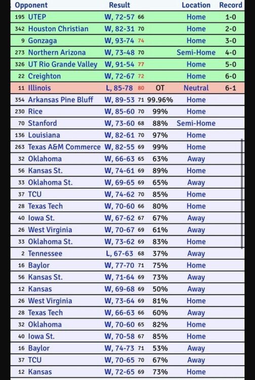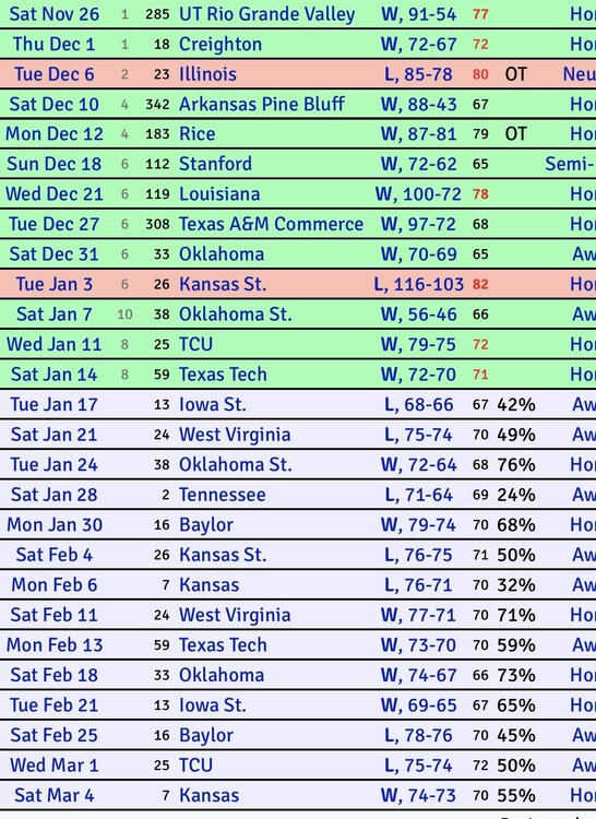 kenpom schedule prediction under chris beard: kenpom schedule prediction after a few weeks of rodney terry: all of this talk about what terry could do to become our next HC is insane. have you people not been watching or something? this team looks nothing like it did under beard, we are markedly worse across the board. we were smothering teams in defense while pushing the tempo on offense and scoring efficiently. now we have no identity, and are a clearly inferior team. i cant believe how many posts have been dedicated to talking about rodney terry becoming our next HC. it's ridiculous. the same board that crushes Barnes and his results now wants to talk about hiring one of his former assistants who is a vastly inferior coach. this beard situation has exposed how little our fans know/care about basketball.8 points
