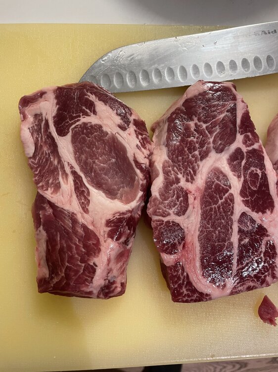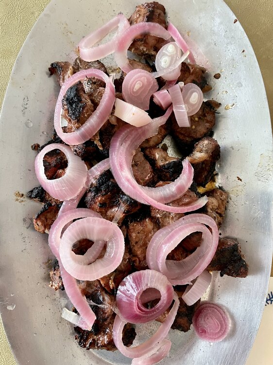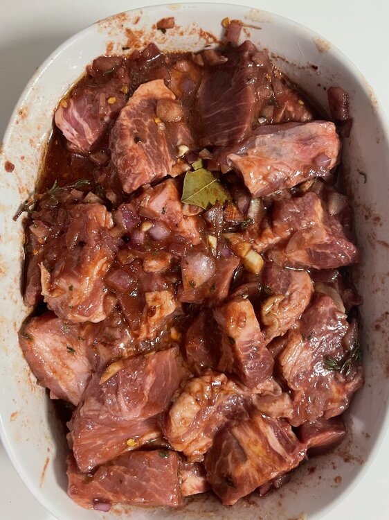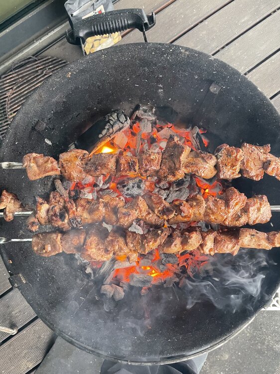 Today I made sashlyk - the accepted Russian word for any meat skewered and grilled across the former Soviet Union. In Christian republics, you get pork. Muslim, likely lamb. Everywhere, chicken and if youβre near a river or ocean maybe fish (sturgeon is popular). Sometimes beef, but beef across the former Union is low quality. This is Georgia-inspired and pork. I bought Prestice (PΕestik) pork collar. Take a look at the intramuscular fat and deep red color. This is a premium product here but not near as expensive as heritage pork stateside. This is what we miss with our factory pork farming. Cubed and into the marinade. Red wine, red wine vinegar, a neutral oil (I used sunflower but canola is fine), tomato paste, chopped onion, chopped garlic, thyme, paprika, red pepper flakes, bay leaf, salt, pepper. I eyeball the ratios. It shouldnβt be too liquid, you want a thick paste. And the red wine is needed but too much makes the meat winey. This is good with pork, lamb, or beef. This chilled out overnight. Thatβs about right. Too long and the vinegar will break down the meat and make it mushy. Open fire, mostly ashed over. This is super rich meat and youβre gonna get flares. Plated with some quick pickled onions. The pickle cuts the extremely rich meat. Not pictured are a tzatziki- like yogurt sauce and some simple grilled peppers and zucchini.10 points