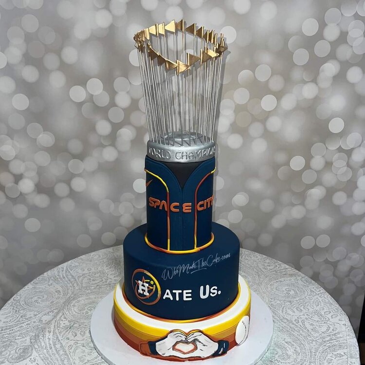 A local cake shop that we used for our wedding 9 years ago popped up on my feed for making this awesome Astros cake. Lots of other fans in the comments were upset by this cake and the hate it brings, and it was pretty funny to read. It's hilarious that Yankees and Dodger fans will go shit on a Facebook post for a cake store because of their deranged hate for the Astros.8 points