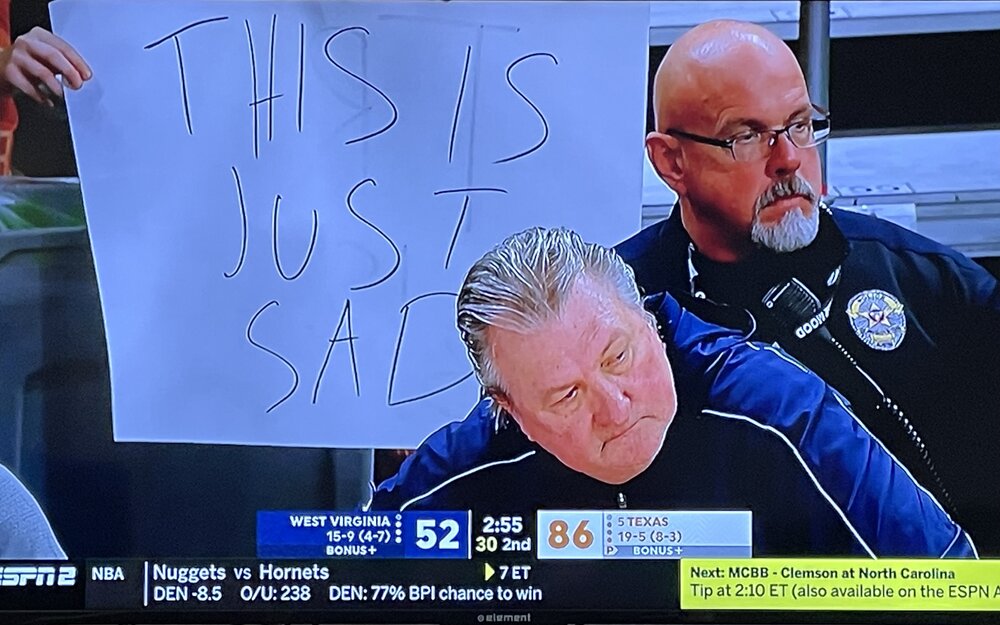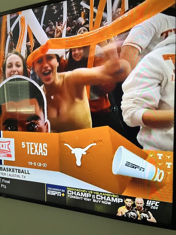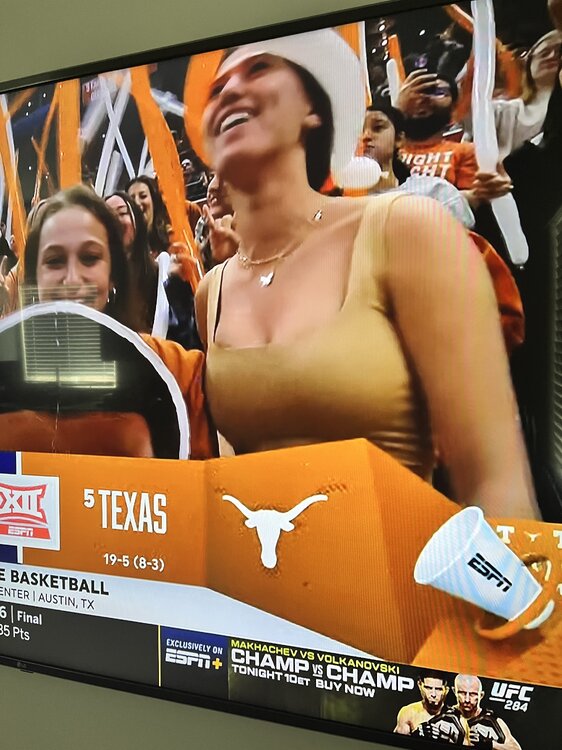 I just got back from the game. WVU players were frustrated to say the least. We killed them. Crowd was so so but had a little life. It was my kids first time at a game and they had a blast. Only FTs we missed are on my youngest son for forgetting to put his horns up, his words. What a great first game for the kids. Hookem7 points