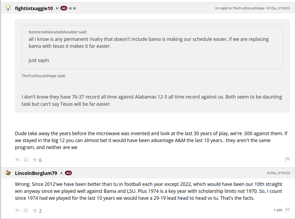 "You can't count the first 17 years of the rivalry (14-1-2 Texas) because most of those games were in Austin obviously with tu refs. But you can count 1909-1939 (14-13-2 A&M) because the playing field was finally level!! But you can't count 1940-1974 (31-3-1 Texas) because we were off winning WWII, Korea, Viet-nam, plus there were no scholarship limits until 1974. But you can count 1975-1994 (14-6 A&M) because the playing field was finally level!! But you can't count 1995-2011 (12-5 Texas) because they had B12 in their pocket, plus cheatin' Mack Brown (who sucked) and cheatin' Vince Young (who sucked)." But you can count 2012-2023 (0 games), since we were secsecsec!, we would have won all 12 (whoop!) games!!17 points