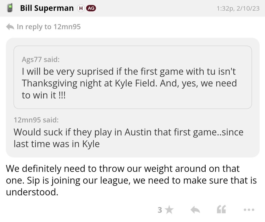 I mean they are right about Texas ruining the SEC, if Texas wasn’t joining the SEC A&M wouldn’t have had to leak the move to the press and completely blow up the SEC well laid plans of playoff expansion, media deals and conference realignment and pissoff the SEC main office and all the other conferences members. If Texas wasn’t joining the SEC they wouldn’t need to massively overpay for the 2022 recruiting class and spit in the face of every coaching staff in the SEC. If Texas wasn’t joining the SEC, A&M wouldn’t be throwing a bitch fit and trying to duck Texas with advocating for a 1-8 conference schedule that is opposed by all the power programs and ESPN, and they wouldn’t be openly talking about hosting a home game for a conference schedule that’s hasn’t been decided yet. If it wasn’t for Texas, A&M wouldn’t be the insane person making a complete ass of themselves and becoming universally despised by everyone involved.17 points