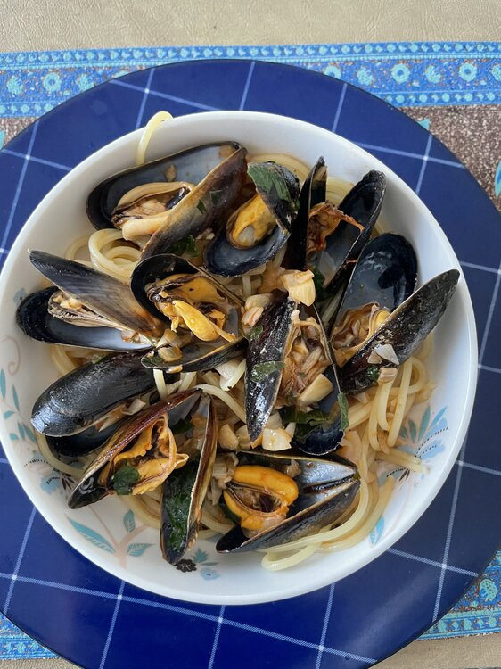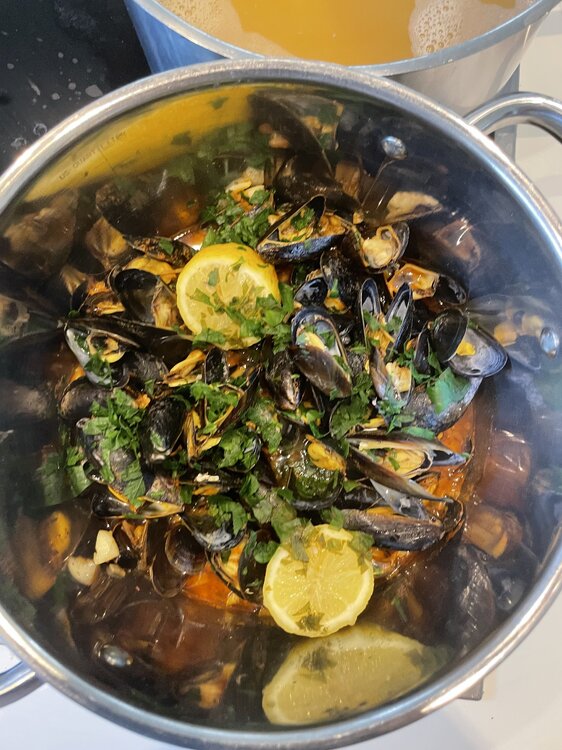 I am gonna x post this to the bivalve thread. I’m most of a bottle of wine and a kitchen cocktail in and don’t care about the length of this post, because this meal fucks. Yesterday I grilled shrimp and with my heads and shells I made shrimp stock. You can add all sorts of aromatics, but I just boiled the heads and shells and added a carrot, some salt, a few stalks of parsley. That’s all prep for today, which is mussels day. Soften up a shallot in some olive oil in a big pot. Then add a bunch of garlic. I used, I don’t know— ten or 11 cloves? The point is that you’re never gonna cook this and say “that was too much garlic.” Measure garlic with your heart. When all that’s soft but not brown, add like a tablespoon of tomato paste and cook that down a bit. Don’t burn the garlic. Then add a big splash of shrimp stock— make sure it’s the darker stuff at the bottom. And then equal parts white wine. And then like a pound, pound and a half of mussels and a halved lemon. Let that shit cook and steam over medium or medium-low. Add a generous handful of fresh parsley at the end. And you should be making spaghetti. And the spaghetti needs to be cooked in about half shrimp stock and half salted water. And then when it’s done, you put the spaghetti in a bowl, top with a ton of mussels, and a ladle of that garlicky wine cooking liquid. And then also, you need like two baguettes for a family. The mussels are great but the main event is mopping up that garlic-wine-shrimp broth liquid with a baguette. Italians don’t mix bread and pasta but you’re not in Italy and this is good as fuck, who cares what they say. You can make all this without the shrimp stock but you’re not really getting the full meal that fucks if you do.9 points