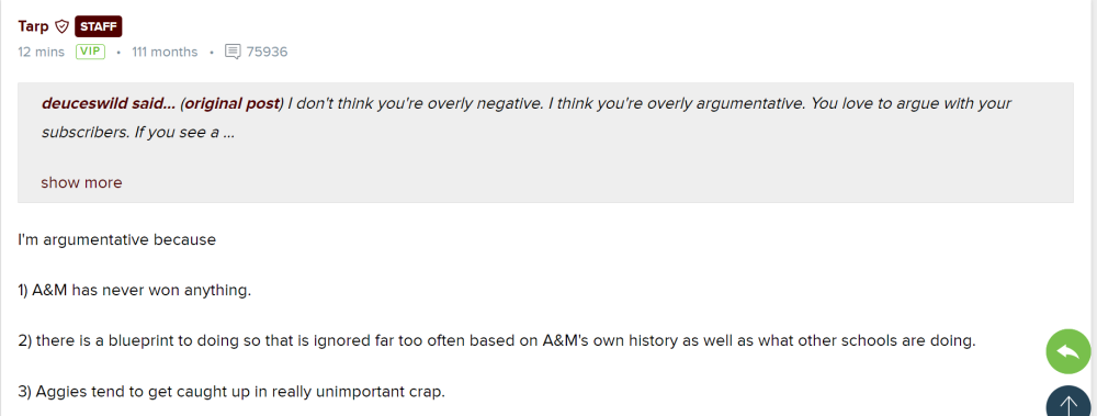 Murphy apparently likes being at Texas and thinks he's being developed well, particularly the mechanical side. He's had some maturity issues and they've worked with him on that. His family and advisors think he's in a good spot. The pitch is basically this: You're going to be the back-up for the 2023 season to a guy that has high draft potential and also might get hurt. The guy behind you wants to redshirt. You will almost certainly get chances to play this year and put good film together. If you just end up winning the spot, why leave? If you don't, but you play plenty and look good, you're going to get paid by someone via NIL before 2024. You can't lose by staying here and continuing to become an NFL-ready QB. I don't know how replicable the situation is for the future, but I do believe that schools and staffs that can show a history of development will be able to manage depth at historically normal levels for those positions in which the development history is true. NIL will also matter to some degree, but that's more where the floor for the roster component comes in. Murphy is likely getting some NIL or in line for some, but nothing crazy (this is speculative, I don't know anything on this part as yet). Anyone approaching him in the portal was unlikely to have been willing to bid high enough to offset all of the UT/Seven Loss Steve positives for 2023. Or, maybe there's a chick he's in love with and doesn't want to go to Tuscaloosa, Lansing or UCLA and leave her.11 points