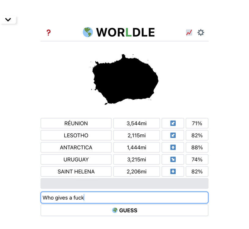@conVINCEd Man, I don't know what you did to piss off Worlde, but that is not the one I got. Maybe it already rolled over to a different one for me. Wordle 707 4/6* ⬛🟨🟨⬛⬛ ⬛🟩🟨⬛🟨 ⬛🟩⬛🟩🟨 🟩🟩🟩🟩🟩 Daily Quordle 488 7️⃣8️⃣ 5️⃣6️⃣ m-w.com/games/quordle 🟨⬜🟩⬜🟨 ⬜⬜⬜⬜⬜ ⬜⬜⬜⬜⬜ 🟨🟨⬜⬜🟨 ⬜⬜⬜⬜⬜ ⬜⬜⬜⬜⬜ ⬜⬜⬜🟨⬜ 🟨🟨⬜⬜⬜ ⬜🟩⬜⬜⬜ 🟨⬜⬜⬜⬜ 🟨⬜⬜⬜⬜ ⬜🟨⬜⬜⬜ 🟩🟩🟩🟩🟩 ⬜⬜⬜⬜⬜ ⬛⬛⬛⬛⬛ 🟩🟩🟩🟩🟩 ⬜⬜⬜⬜🟨 🟩⬜⬜⬜⬜ 🟩⬜🟩⬜⬜ ⬜⬜🟩🟨⬜ 🟨⬜⬜⬜⬜ ⬜⬜⬜⬜⬜ 🟩⬜🟩🟨🟩 ⬜🟩🟩⬜⬜ 🟩🟩🟩🟩🟩 ⬜⬜🟩🟩⬜ ⬛⬛⬛⬛⬛ 🟩🟩🟩🟩🟩 Daily Sequence Quordle 488 4️⃣5️⃣ 6️⃣7️⃣ m-w.com/games/quordle ⬜⬜⬜🟨⬜ ⬜🟨⬜⬜🟩 🟨⬜⬜🟨⬜ ⬜⬜🟨⬜⬜ ⬜⬜⬜🟨⬜ ⬜🟩⬜⬜⬜ 🟩🟩🟩🟩🟩 ⬜⬜⬜⬜⬜ ⬛⬛⬛⬛⬛ 🟩🟩🟩🟩🟩 🟩⬜⬜🟨⬜ ⬜⬜⬜⬜⬜ ⬜⬜⬜🟨🟩 ⬜⬜🟨⬜🟨 🟨⬜⬜⬜⬜ 🟩⬜⬜🟨🟩 ⬜🟨🟨⬜⬜ 🟨⬜⬜⬜⬜ ⬜⬜⬜⬜⬜ ⬜⬜⬜🟨⬜ 🟩🟩🟩🟩🟩 ⬜⬜⬜🟨🟨 ⬛⬛⬛⬛⬛ 🟩🟩🟩🟩🟩 Blossom Puzzle, May 27 Letters: A C E T I N V My score: 278 points My longest word: 10 letters 🌺 🌼 🌻 🌸 🏵 💮 💐 🌹 🌷 🌺 Play Blossom: https://www.merriam-webster.com/word-games/blossom-word-game #Worldle #491 1/6 (100%) 🟩🟩🟩🟩🟩🎉 ⭐⭐⭐🏙️🪙 https://worldle.teuteuf.fr10 points