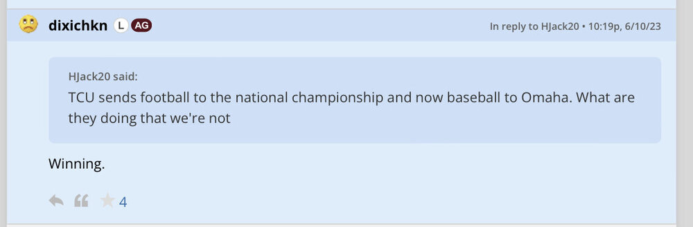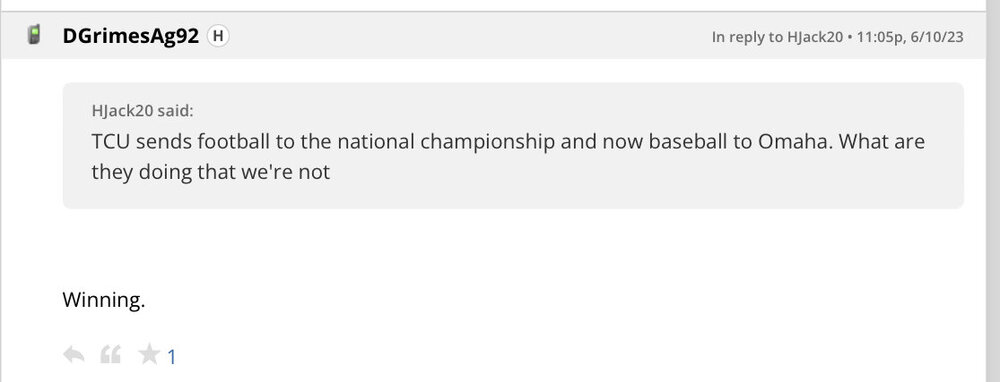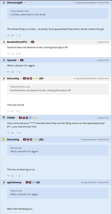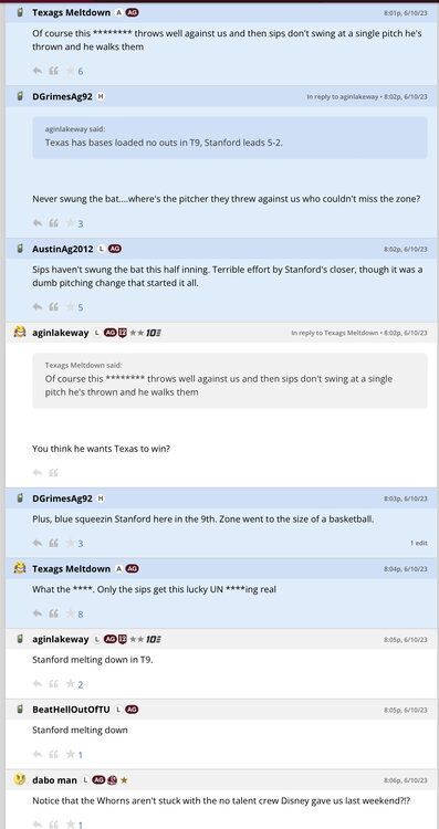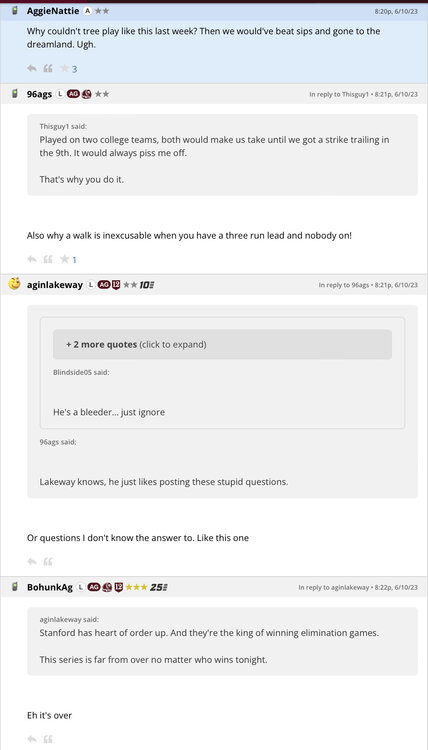 This shit still amazes me. It shouldn’t, but it does. The notion that a “Mickey house path” to the CWS by beating two national seeds, twice each, in their houses on opposite ends of the map is absurd unto itself. But no, that’s not enough. Inside of that premise is that one of those national seeds already put a fucking bullet through the head of the aggie 2023 baseball season in order to face Texas in the first place. It’s mind blowing.15 points