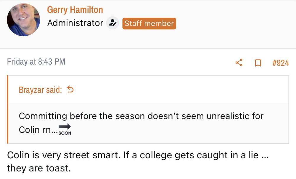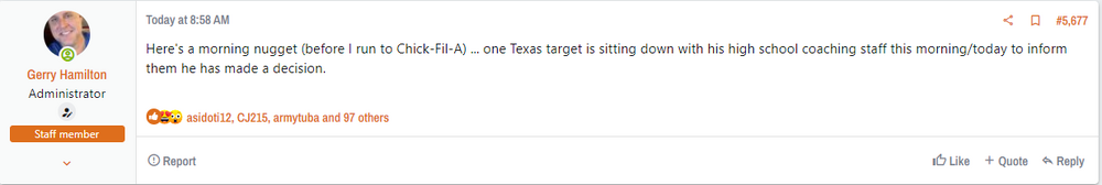 I was in Vegas, so I haven't talked to anyone meaningfully. @RGBIII or someone else might have heard miscellany from folks they chat with, but I've just had some text exchanges. Prior to last weekend, the plan for both weekends was to close the core of a well-rounded class heading into the dead period. After last weekend, things were on the right path. Gibson further confirms that. The Kibble situation amounted to "we're taking 5 guys (I think it is 5, if that isn't the number, he was still given the number) in this class and we have more than that who want in, so if you want to be a part of this program, we need to know that now, so we can plan accordingly" and voila, we have the 5th OL in the class. My view on the Saturday morning hype is that a bunch of dominos were falling over. They've fallen over. There will be a steady stream of commitments from here, probably almost all staged for maximum hype and perception. The Mack Brown era of having 15+ announcements within 48 hours of one another is long gone. As someone very involved with marketing in their career, my view is that this is the way. We live in an era in which the player gets put completely on the pedestal and is expected to have their big moment if they're close to being nationally recruited. No one has to like that, but folks should learn to lean into it.41 points