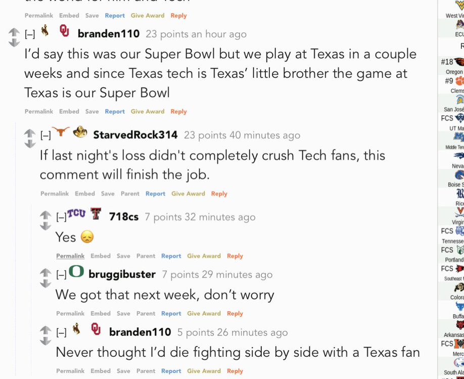 What a great f'ing day of football for those who hate the remaining Texas schools in the Big 12. Reap what you f'ing sow, you hateful shitbags.31 points
