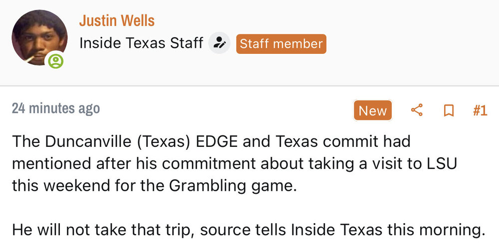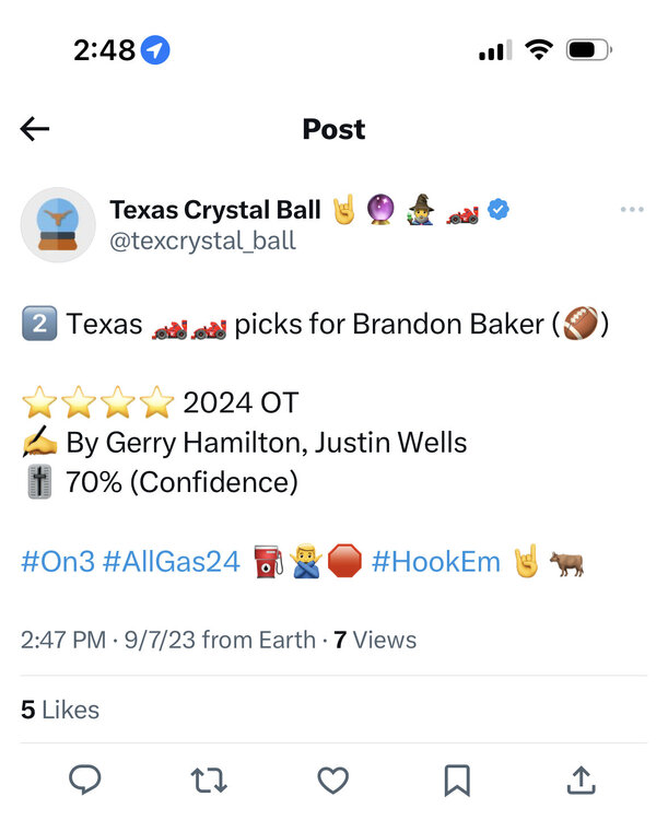 Fong with some updates In the Steve Sarkisian era at Texas, the Longhorns have seemed to win more blue-chip recruiting battles on the trail than they’ve lost, the latest beating rival Oklahoma for Allen (Texas) High four-star edge rusher Zina Umeozulu. One they did lose this cycle was Lancaster (Texas) High Top247 cornerback Corian Gipson, who announced for Clemson in July. I’m not so sure that one is completely over and I’ll keep an eye on the Longhorns for the coveted in-state defensive back moving forward. As we’ve reported in the past, St. Louis (Mo.) University five-star receiver Ryan Wingo is planning to come back to Austin for the Wyoming game next Saturday night. I logged a 247Sports Crystal Ball in favor of the Longhorns following a June swing of official visits which included the Longhorns. There have been times where Missouri has seemed to grab momentum, but there is still a lot of confidence around Austin they’ll ultimately land Wingo, and buzz around the Wingo camp remains very excited about Sarkisian and the program as well. I'm glad I've stuck with my pick. With a decision coming on the horizon, I still like Texas’s position for top-ranked offensive tackle Brandon Baker. And I love my prediction in favor of the Longhorns for in-state five-star cornerback Kobe Black.35 points