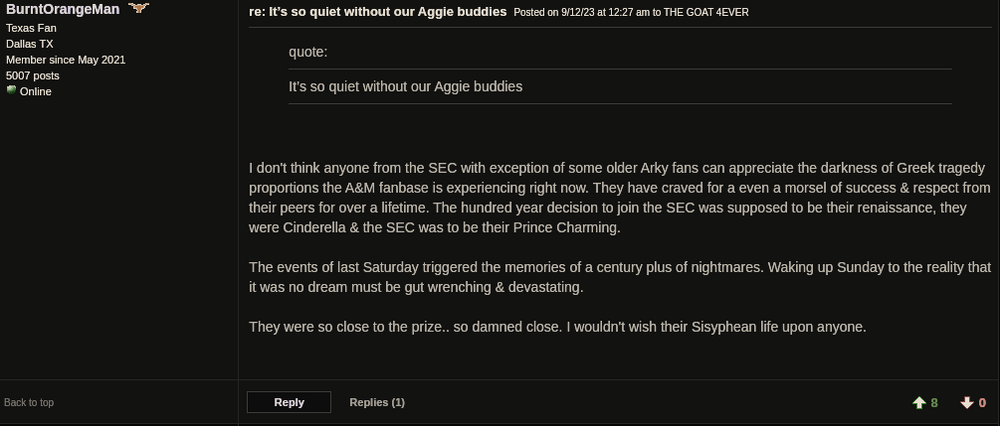 Went back a few pages to share a walk down memory lane with the aggie braintrust. They were really riding high after the New Mexico win. The trash talk and predictions of a ass kicking (from a group 1-6 in last 7 games against power 5 competition--now 1-7) are chef's kiss.12 points