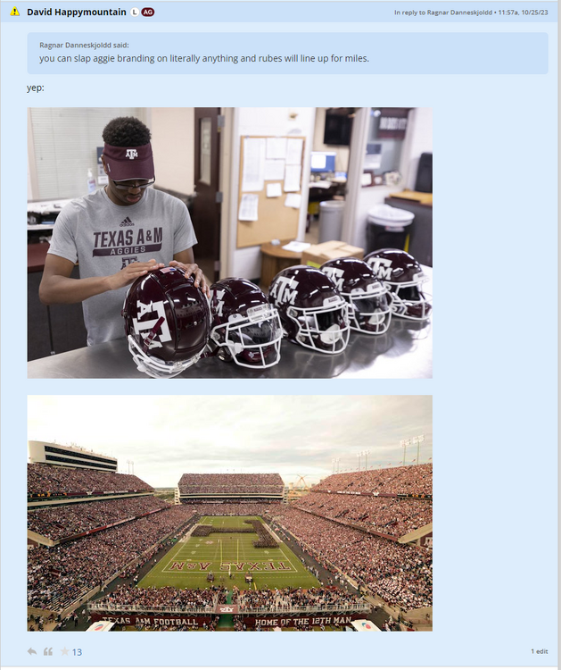 I loved this oneβ¦ βIt's gotta make culture building damn near impossible. How do you trust a guy in the locker room who only came to your school because of money?β Iβm sure those random Tennessee and New Jersey recruits came for the majesty of College Station.12 points