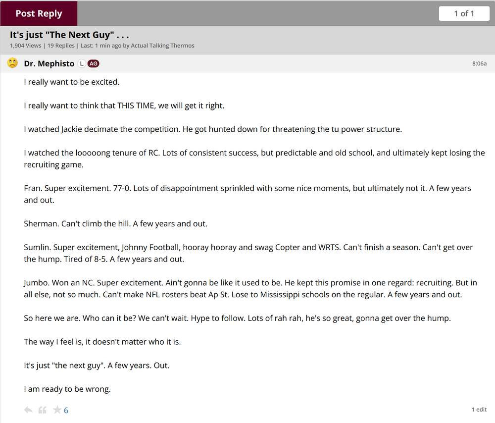 Had a conversation with a friend who has gotten involved with ATM over the last decade as he's made a fortune and donated. He helped land Fisher and the 2022 class and has been involved with "NIL". He's whip smart and a very likeable person, but he's also a killer in the business world and a full-blown red ass. He got a call to help out on the Fisher firing and told them he'd help if they'd open up a matching amount of money for academic scholarships and fire everyone involved with Fisher's contract. They decided not to take his money this time. There is a faction that wants Kingsbury and no one cares. There's a faction that doesn't want Traylor. I don't know how much those groups and guys like my friend all overlap, but NIL at ATM is highly likely to be taking a hit for a while.31 points