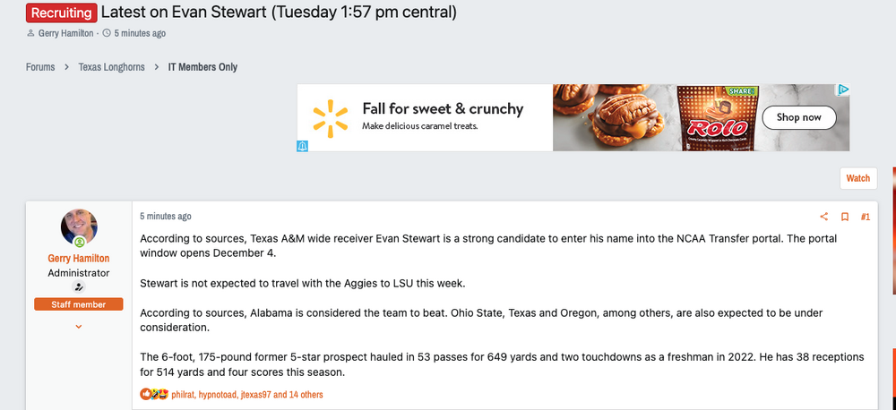 It's not a good counterpoint, outside of humor. The "Evan Stewart is committing to/decommitting from/going to sign with/transferring to Texas" saga has been hashed 1000 times on the recruiting board. It's tiring. Suffice it to say, the guy is a quitter, a drama queen, only out for himself, made of glass, and big time into weed. He pushed Jimbo Fisher around like he had his hand up his ass. I don't want that shitbag any closer to Texas than he is right now. Alabama is looking to overpay in the portal this cycle, apparently, and Stewart is a target. I'm hoping he eats up a chunk of their budget and then pulls his bullshit there and attempts to burn the whole program down because he's not getting his way. Outside of QB, WR is the most talent rich position in the portal every single year. I doubt that ever changes because of the prima donna/high demand nature of the position. Texas will be one of the magnets for the best WRs out there. Let Stewart go take a heaving dump on someone else's future.11 points