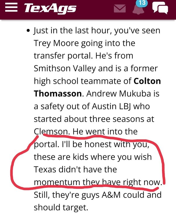 A few things worth fleshing out here, in case folks care. There have been a few really big donors who are fatiguing. The medium-sized guys, call it $10k-$100K annually, aren't fatiguing, there just needs to be more of them. The crowdfunding level participants are great and growing, but that kind of base takes years to grow. What's happening in the portal is unlikely to ever be something that collectives can truly handle, Texas or anyone else. TOF is helping build a floor. Is it going to help us land a 5 star recruit? Tangentially. Is it going to help young backups heading towards starting roles and specific key players at non-star positions? For sure. This is football only. A lot of good stuff is also happening in many of the other sports. TOF still needs a ton of help in football and needs CDC backing it with the guys in his pocket. That considered, some of the dire statements you may read elsewhere are coming from a key and sizeable donor who is concerned directionally and rightly fatiguing. There's more activity than just his efforts though, and that's honestly never considered when those thoughts are posted. Your point about Nolen is likely very valid in multiple instances for ATM, but regarding Nolen, they had a deal with him before cutting Fisher loose, covered by the money. Them being delusional about Robinson staying is likely triggering the ol'renegotiation with Nolen. In reality, Nolen is a good DL and not a great DL. He has a low pain tolerance and pulls himself out of games regularly. He was the highest rated guy in his class, and that is what is causing the aggies to desperately try to hang on to him. Perception. That's it. Liucci is smarter than I give him credit for, then, as I'm kind of afraid of Colton Thomasson following his friend to Texas as well.18 points