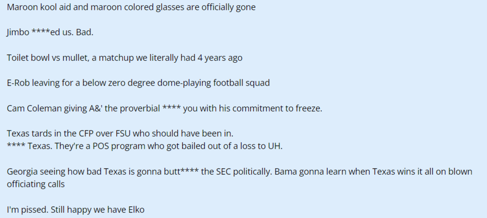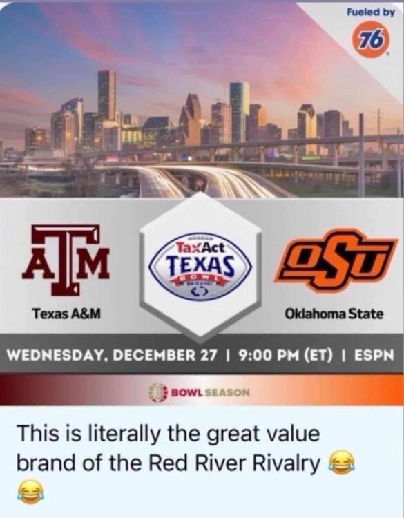 In 2018 Texas A&M declined to schedule Texas in non-conference games for 2022 and 2023 because their schedule was full. They chose to play (lose to) Appalachian State and Louisiana-Monroe instead of playing Texas. Texas instead scheduled Alabama. Texas beat Alabama in Tuscaloosa in 2023 which is the reason Texas is in the playoff. Texas A&M's cowardice (and pathological need to make every decision based on how it would affect Texas and public perception that they're UT's little brother) is why Texas made the College Football Playoff. In 2021 Texas A&M leaked the news that Texas and Oklahoma were going to join the SEC in an effort to sabotage the move. They thought that they had enough stroke to prevent the move by making it public and reminding the world of the so-called gentlemen's agreement. They leaked this before the various conference commissioners met to vote on the start of the 12-team playoff. Alarmed by this move that further shifted the power between conferences, the Big 10, Pac-12, and ACC formed an alliance and voted against starting the 12-team playoff in 2023. It would later be approved to start in 2024. Texas A&M's cowardice (and pathological need to make every decision based on how it would affect Texas and public perception that they're UT's little brother) is why Florida State (and Georgia, and Ohio State, etc.) did not make the College Football Playoff. Literally everything they're complaining about is their fault.16 points