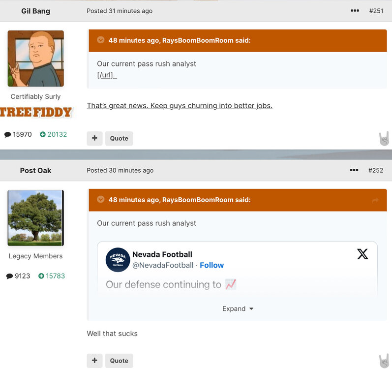 I posted this in another thread somewhere, but I think there's an opportunity moving to the sec to do a surly version of sec rant. The balls on any poster on that gawd awful forum talking shit about this place is (fricking) rich. So maybe add an sec board that's not so longhorn focused and maybe get some new blood that way? Somewhat related to that and as mentioned upthread, I think a lot of the crowd sourcing / fatwa shit is lame. A few folks from hardcore husky - who were admittedly terrible - got kicked off that probably didn't deserve it. People need to use the ignore feature more unless a poster does something egregious. I thought we came off like thin skinned pussies and it's generally better to keep them around and mock them for being idiots than ban them. Also, if things get really bad I can start taking pictures around my house again. Just let me know.14 points