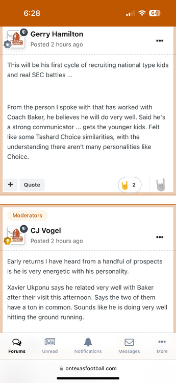 The partner sites have deals with On3 of varying length. Then they get renewed, or one side or both decide to part ways. I don't think IT is anywhere close to that fork in the road. The best way to look at OTF is that it is a new option in the market for following longhorn related news, discussion and recruiting. They have some interesting discussions and work output coming down the line. I think Bobby and Gerry are the best in the business, they'll outwork everyone else, and they have good chemistry on camera. Vogel is a good addition as well.14 points