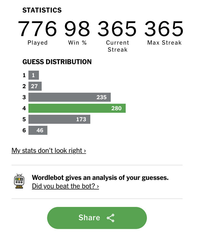 Posting stats in honor of a one-year streak in Wordle. I leave this evening for Madagascar for work, so almost certainly will lose the streak this next couple of weeks. My stats are nothing to brag about. Way too many double and triple bogies, not nearly enough eagles. Only one ace. Wordle 978 4/6 🟨⬜⬜⬜🟨 ⬜⬜⬜⬜🟩 ⬜🟩🟩⬜🟩 🟩🟩🟩🟩🟩 Worked in this country for 12 years. Was not aware they crossed the 5 million population mark. #Worldle #762 1/6 (100%) 🟩🟩🟩🟩🟩🎉 🧭⭐🚩🔤🗣️🪙 https://worldle.teuteuf.fr Daily Quordle 759 8️⃣6️⃣ 7️⃣4️⃣ m-w.com/games/quordle/ ⬜🟩⬜⬜⬜ ⬜🟨⬜⬜🟨 ⬜🟨⬜⬜⬜ ⬜⬜⬜🟨⬜ ⬜⬜⬜⬜⬜ ⬜⬜⬜🟩⬜ ⬜⬜⬜⬜⬜ ⬜⬜⬜🟩⬜ ⬜⬜⬜⬜🟨 ⬜🟩🟩🟩🟩 ⬜⬜⬜⬜🟨 🟩🟩🟩🟩🟩 ⬜⬜⬜⬜⬜ ⬛⬛⬛⬛⬛ 🟩🟩🟩🟩🟩 ⬛⬛⬛⬛⬛ ⬜⬜🟩⬜🟩 🟩⬜⬜🟨🟨 ⬜⬜🟨⬜⬜ ⬜⬜🟨⬜⬜ ⬜⬜⬜🟨🟨 🟩🟩⬜🟩🟩 ⬜⬜⬜🟨🟨 🟩🟩🟩🟩🟩 ⬜🟨⬜⬜⬜ ⬛⬛⬛⬛⬛ 🟨🟨⬜⬜⬜ ⬛⬛⬛⬛⬛ 🟩🟩🟩🟩🟩 ⬛⬛⬛⬛⬛ #travle #435 (4/9) ✅✅✅✅ https://travle.earth Connections Puzzle #256 🟦🟩🟩🟩 🟨🟨🟨🟨 🟩🟩🟩🟩 🟦🟦🟦🟦 🟪🟪🟪🟪9 points