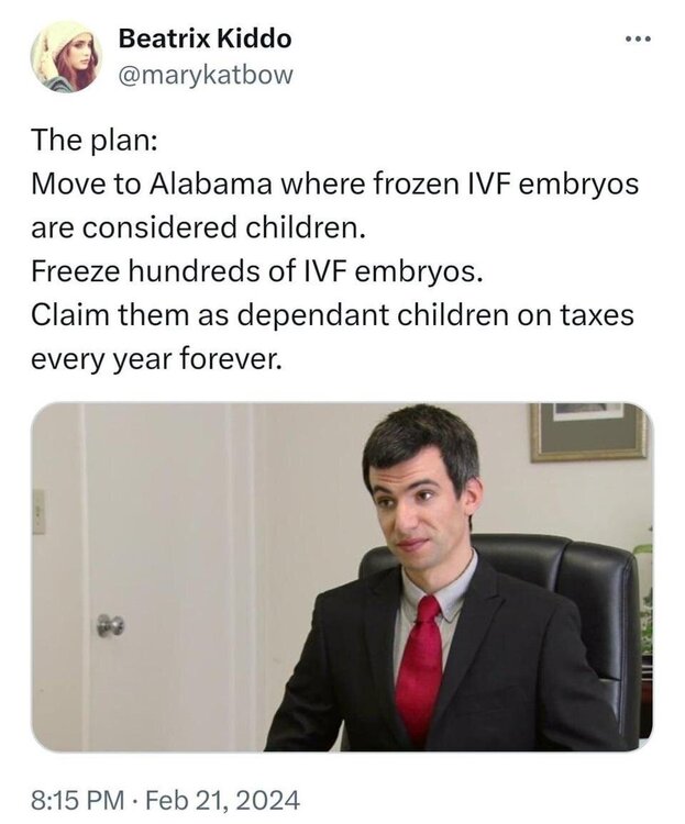 We have one amazing child through IVF. We were late 30s when we started trying to become parents and had one natural pregnancy that resulted in miscarriage. After about a year of trying, we saw a fertility specialist who recommended skipping straight to IVF due to our age, and we got lucky on the first egg retrieval and implantation cycle and now have a happy and healthy one year old daughter. I know 4 other couples who are at various points in the infertility struggle, some of which are failing IVF, and I feel awful for them. We also have several embryos frozen that we are unlikely to use because the first childbirth and recovery was physically very difficult for my wife. We don’t have much of an ethical dilemma over that because we don’t consider frozen embryos to be people. I don’t understand why or how someone could define an embryo as a human being, and assuming most people who take that stance are doing so for religious reasons (radical Christianity), I’m genuinely curious where in the Bible this is even close to being defined? If not the Bible, then how do they arrive at these ideals? (I realize the definition of when life begins is pivotal to the abortion debate, which I admittedly have mostly ignored until recently, so probably this has been beat to death.) Also, it would be nearly impossible to argue against IVF without also opposing oral contraception and IUDs. Those methods allow fertilization to occur in vitro, but then prevent the fertilized egg from implanting into the endometrium. So I suppose everyone in Alabama is committing murder when they have sex while taking birth control? It will be interesting to see if this gets adopted in other states. I thought IVF would be untouchable due to the fact that most people on both sides of the political aisle probably have family or friends who have used IVF and witnessed firsthand the joy it brings to the world, but here we are. Everyone who was paranoid about gay marriage, trans rights, and oral contraception was absolutely right to be worried.11 points