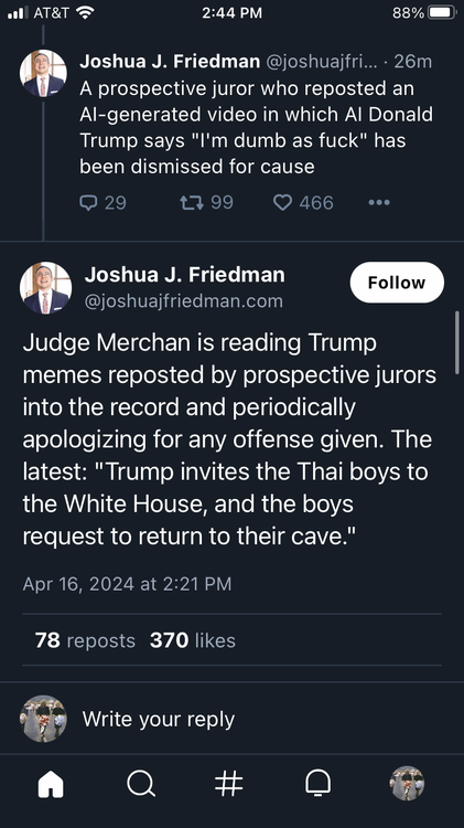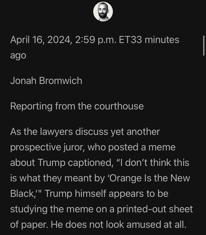 I absolutely love this. Trump having to sit there and take this feedback from the populace rather than his cult. Judge says βMr GenXer, we found several posts that you made on a site called surlyhorns that seem prejudicial to the defendant. The court will read several of them now..β GenXer being dismissed as a juror.25 points