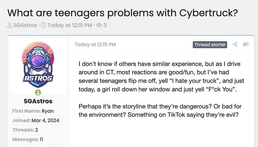 I was riding in the car with my brother-in-law when we saw a Cybertruck. He looked at me like a sad puppy and asked me to confirm how stupid they looked. I was like wtf dude, of course they are fucking ugly as fuck! He just gave me a look and said, βMy wife thinks theyβre super fucking cool and look awesome. That means she has bad taste and I must be ugly as fuck.β I didnβt know what to say because he was having a midlife crisis epiphany moment, so I just blurted out, βWell my sister was a lot thinner back when yβall were in college, so donβt worry about it.β We just sat the rest of the drive in silence saying nothing as a second Cybertruck later passed us.16 points