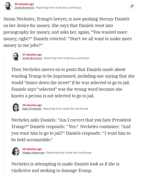 And now, heeeeers Stormy: And the trial is on break. Trump walks out, on a break, ahead of his sizable legal team and todayβs entourage. Stormy Daniels has been telling a similar version of this story for at least 13 years, since a 2011 interview that was not published at the time because Michael Cohen, then Trumpβs fixer, threatened the publication, "Life & Style." At the time, Daniels said that regarding Trump's offers of putting her on The Apprentice, she came to wonder βif he was just flat-out lying the whole time,β according to a transcript. She said, βI didnβt have any unrealistic expectations of actually being on the show; I figured my chances were 50-50.β The interview was ultimately published in 2018, after the story of the hush-money payment came out. One of the undercurrents of this testimony is how mocking and derisive Stormy Daniels is of Trump. In her telling, she was experiencing him that same way in real time during that evening in 2006. She has described him as being arrogant, and interrupting her while she talked. Stormy Daniels says that Trump told her she reminded him of his daugher, presumably Ivanka. βSheβs smart and blonde and beautiful and people underestimate her as well,β Daniels said Trump remarked. Stormy Daniels now takes on the defense's argument about her directly, saying that it was Trump himself who invited her to come on βThe Apprentice,β not the other way around. This is fascinating, because we have seen many times the way that Trump accuses his adversaries of the same faults that heβs accused of. Here, Daniels is suggesting she wasnβt the one trying to use βThe Apprenticeβ β he was, for sex. Stormy Daniels says she asked Trump during their dinner: βAre you always this rude? Are you always this arrogant and pompous? Like you donβt even know how to have a conversation.β Trump clearly mouths βbullshitβ as Stormy Daniels recalls playfully spanking him with a rolled-up magazine, and saying he was much more polite afterwards. I wrote recently about how Trumpβs advisers see the process as its own punishment in this case, and this testimony underscores that as much as anything. This testimony is hard to listen to for the audience; Trump is image-obsessed and controlling, and this is belittling by Stormy Daniels. Stormy Daniels says that during her dinner with Trump, she asked about his wife. He told her, she says, not to worry because the two did not βeven sleep in the same room.β Trump and Melania were married in 2005, the year before this encounter. Trump shakes his head slightly and gives a sour look as Daniels says he told her that he didn't sleep in the same room as his wife. Trump is well known as a germophobe. Stormy Daniels has previously said that they had sex without a condom. This section of testimony β in which Daniels says she told Trump how frequently she was tested for sexually transmitted diseases β could help bolster the credibility of her story. Juan Merchan, the judge, has asked Daniels, who is on a long digression, to slow down. She has been speaking quickly the entire time she has been on the stand. Stormy Daniels has been directing many of her answers about the meeting with Trump in the hotel suite β which she described as much bigger than her home β directly to the jury, which is mostly expressionless. He was 60 at the time of this meeting, and Daniels was 27. The jurors are completely inscrutable as they listen to Daniels express very specific, well-honed opinions about adult films. It reminds us just how little we know about how they are reacting to this. Stormy Daniels says that Trump took an interest in the business aspects of her industry and asked about unions, residuals, and health insurance, as well about S.T.D. testing. Stormy Daniels is now talking about meeting Trump for dinner. She says that when he first emerged from his hotel suite, he was wearing βsilk or satinβ pajamas, which Daniels compared to those often sported by Hugh Hefner. She asked him to change, and he returned in more standard dress clothes. As Daniels is talking about entering Trumpβs hotel suite, Trump whispers to his lawyer. He canβt stand feeling or appearing weak or powerless. But thatβs exactly what he is here as Daniels is describing, in extensive detail, an encounter he continues to maintain didnβt happen. Daniels is describing Trumpβs suite in Lake Tahoe in minute detail, every aspect down to the color of the tiles. She seems to have a photographic memory. Other presidents have had their secret affairs whispered about over the years β think John F. Kennedy β but it is surreal to have Stormy Daniels describing an encounter with Trump in this way, live from the witness stand. Stormy Daniels says that the first person she mentioned the dinner invitation to was her publicist, which to some extent gives the defense some ammunition, as theyβve painted Daniels as a grifter who was seeking to use Trump to benefit her career. The prosecutor, Susan Hoffinger, may be leaning into that in the same way her team has elicited damaging testimony about Michael Cohen: Theyβd rather that jurors hear it from the prosecution's witnesses up front, rather than allowing the defense to spring it on the jury as if the state were trying to hide it. Daniels recalls that her publicist urged her to go to the dinner, and asked her: "'What could possibly go wrong?'" Susan Hoffinger, the prosecutor, is asking about Trump inviting Daniels to dinner. Daniels says that she was approached by βKeith,β meaning Keith Schiller, Trumpβs ominpresent bodyman. She says he took her number, though she refused the invitation initially. Daniels testifies that she saved Schiller in her phone as βKeith Trump,β and that his number remains in her phone to this day. Prosecutors are now showing the famous photo of Stormy Daniels and Trump in the gift shop at the Lake Tahoe resort they met at in 2006. One juror smiles as Stormy Daniels describes her initial react