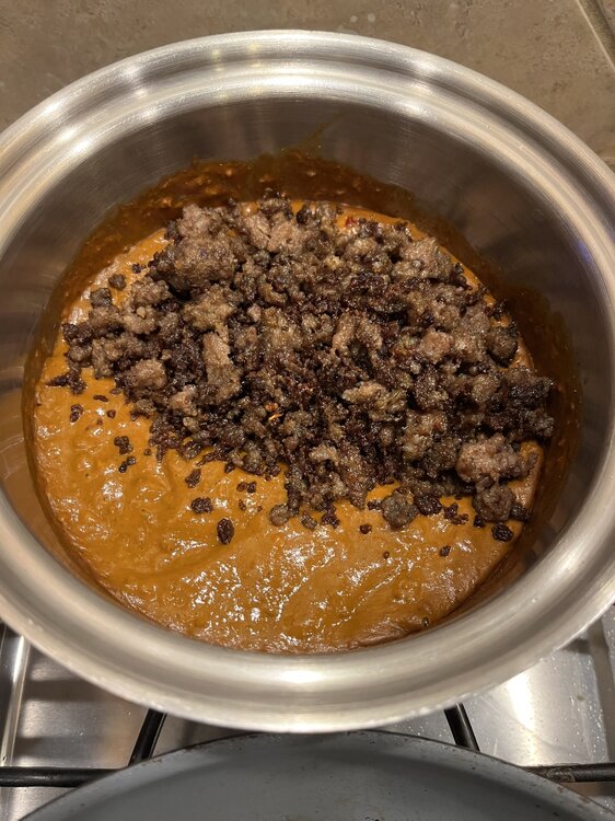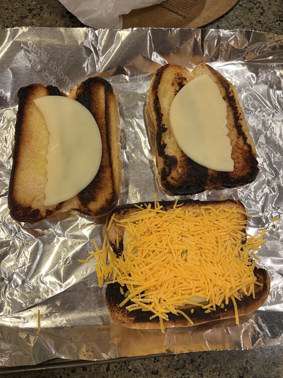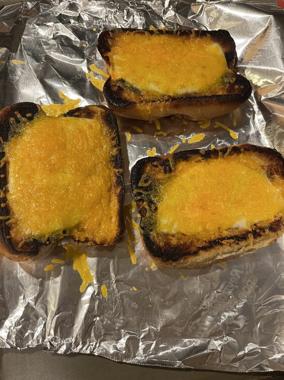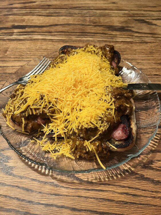 I searched for the cheese hinge thread; can’t remember where cheese hinges are readily celebrated but I think it’s here. I made chili cheese dogs. Originally planned to eat normally but it devolved to fork and knife. fried the buns in butter then broiled the cheese hinges. browned some spicy breakfast sausage and added to the chili. pan fried the dogs in the sausage grease. smothered in chili and added more cheese.12 points