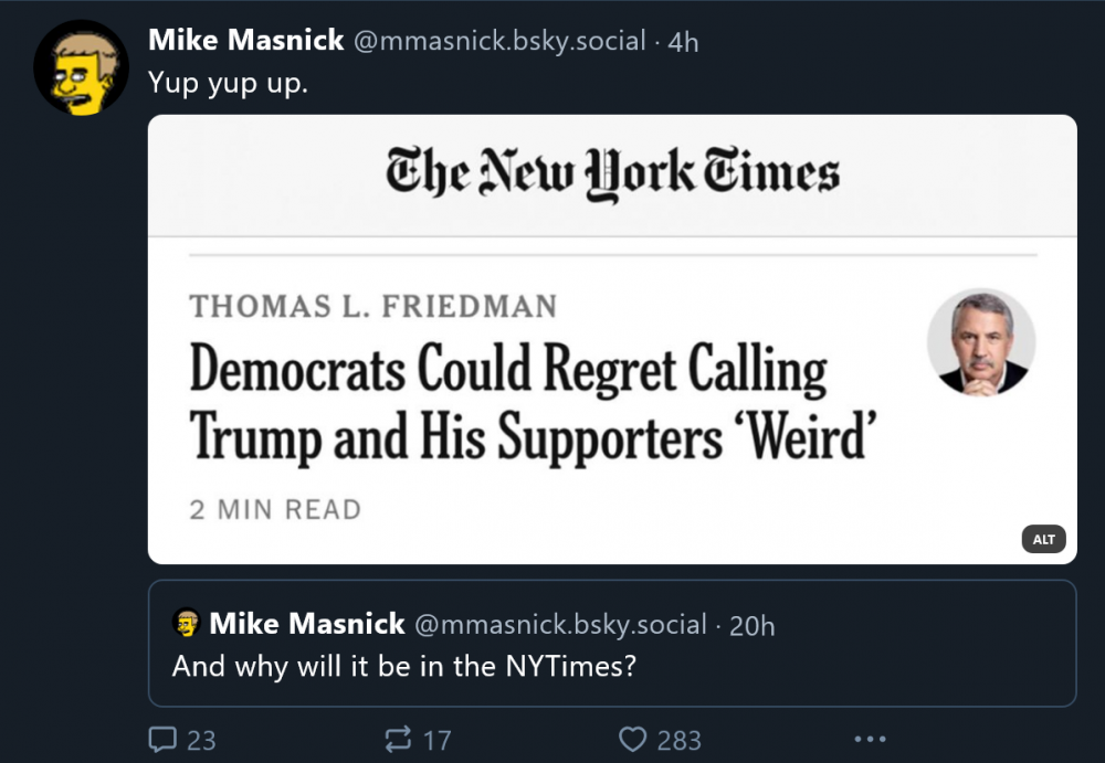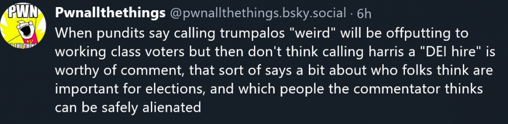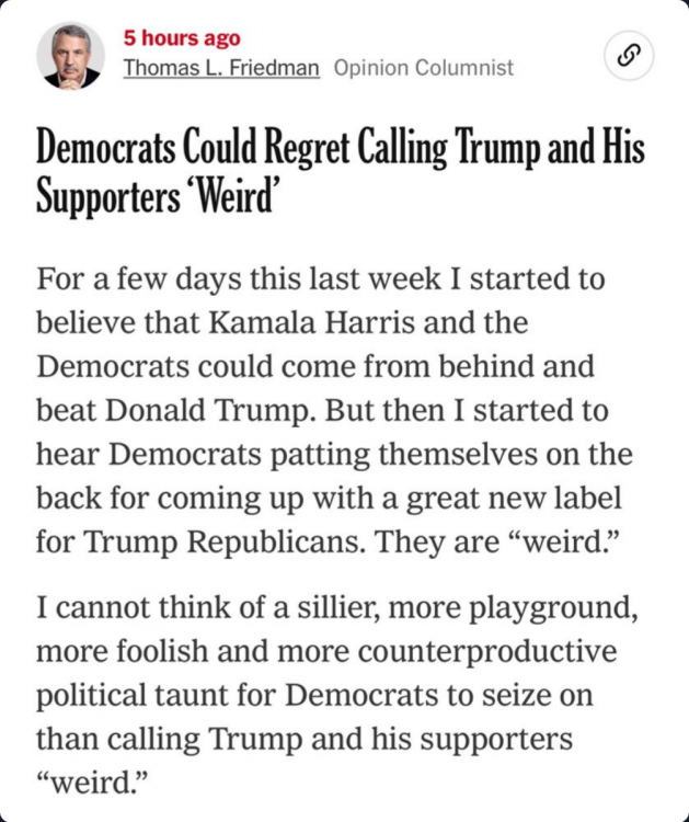 The reason "weird" works is that it touches the core of GOP's insecurities. They are so very concerned with being the "in" group, as evidenced by their constant screeching over media, Hollywood, tech, and pop-culture being aligned against them. Its why they cling so desperately to their B and C list celebrities, and why they elevate no-name mumble rappers simply bc the they're wearing a MAGA hat. Calling them Nazis or racists really doesn't move the needle. They just smirk and embrace it. But "weird" is the kid who got ignored at school and ate lunch alone.20 points