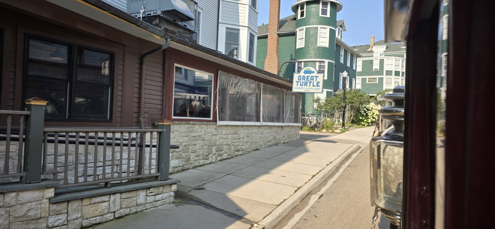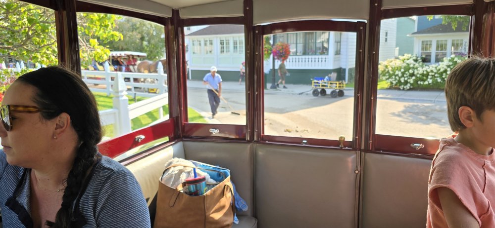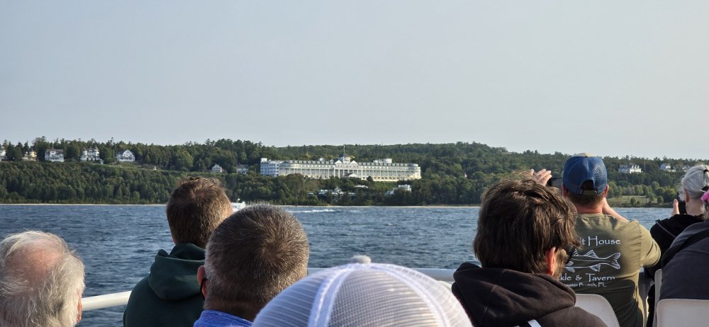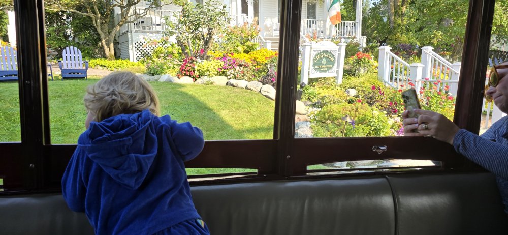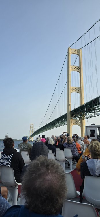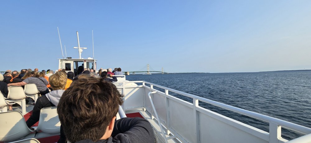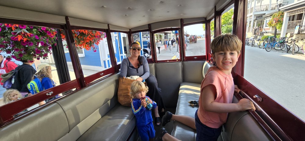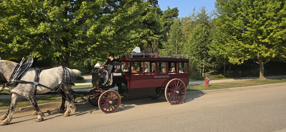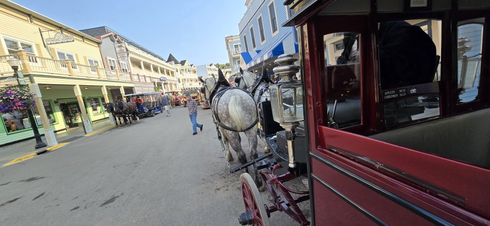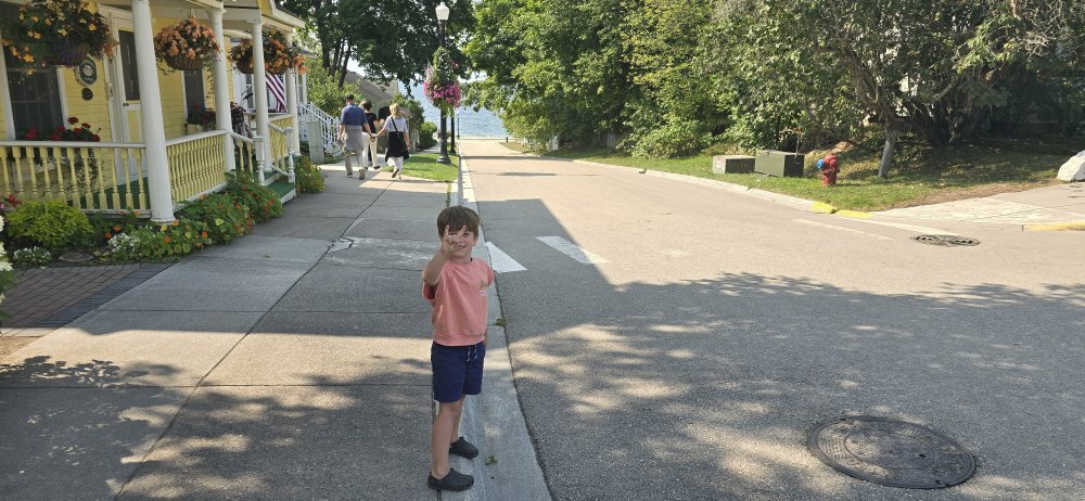Alright. It's been a fucking morning. Kids ate paw patrol Mac and cheese for breakfast which was not enough fuel to get us to check in at the Hotel, but damn close. We left early from the motel we stayed in and they retroactively decided dogs weren't allowed when we were leaving so they tried to hit us with a $50 fee. I told them to pound sand and take it up with Expedia. Boarded the dog JoJo who has been the best behaved on the entire trip (including me) Got to the ferry place and kids and wife were in full meltdown mode already. From the 9AM to 10AM time slot they will actually detour slightly to go under the bridge instead of straight to the Island. We got the 930. Gunnar getting horned. 20240904_093017.mp4 Sights from the boat dock to the bridge. Viking cruise ship crossed under the massive bridge showing you the scale. Really incredible engineering here. View of the island and some rich peoples mansions View of the Grand Hotel where we are staying from the boat. Map of the island Got a horse drawn carriage up to the hotel and snapped a bunch of shots. Didn't get one before hopping on but got one on the way down. Woody and Buzz were our horses. someones gotta shovel the shit! Check in isn't till 4PM so we are early as fuck and have to figure out how to kill 3 hours without a nap for Rafa. Found a cool arcade the boys had a blast. Ate lunch in town after walking down and had some smoked whitefish dip. Rafa crashed out hard on the walk back and is currently parked in the corner in the room. random shots18 points