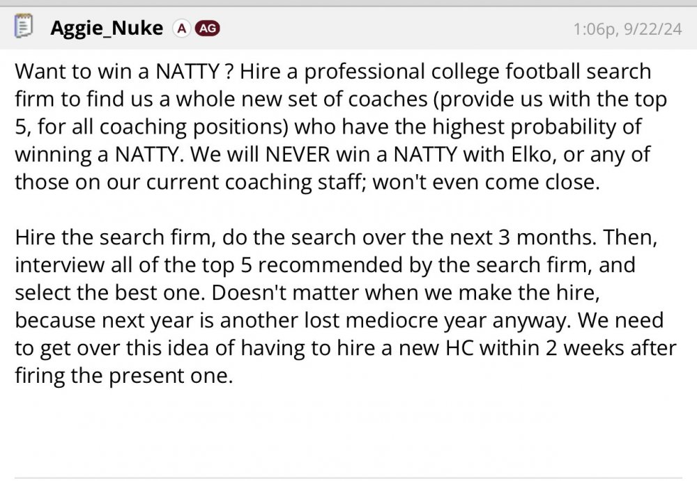 ...and? Everything you've suggested would potentially be the seeding of a long term overhaul of their AD where they behave in a way...more adult than they have their entire existence. Even if unlikely, why would any of us want to upset that apple cart of fucking sadness? What we really need is Tarp to melt down, and then have him completely villifed by all parties involved, turned into a shining example of being a bad Ag, and then they rehire Taylor Hamm. All while we observe, laughing uprioaroiusly, and toasting to the next 100 years.18 points