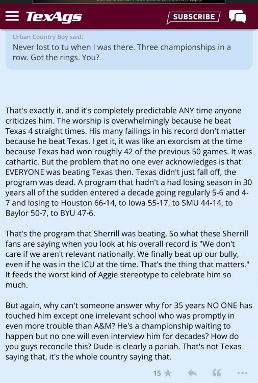 I've thought this should happen for a long time. But maybe the wounds are just too deep. I was never really that passionate about Applewhite over Simms or vice versa. They both had their strengths and weaknesses, and both had their great games and stinkers. Unfortunately, Chris's bad games were just in historically bad losses. But I always liked him and rooted for him, and as much as I hated that loss to Colorado, I hated even more the way a very unattractive portion of our fan base shit all over him. I remember when Sam Ehlinger was our QB, and Simms was talking about him and the Longhorns on some radio show or podcast, and they played for Chris a video of Sam playing catch with his dad when he was 4-5 years old, and little Sam Ehlinger yells out, "I'm Chris Simms!" Chris was visibly moved by that.26 points