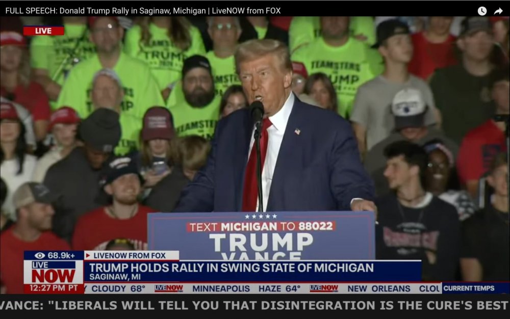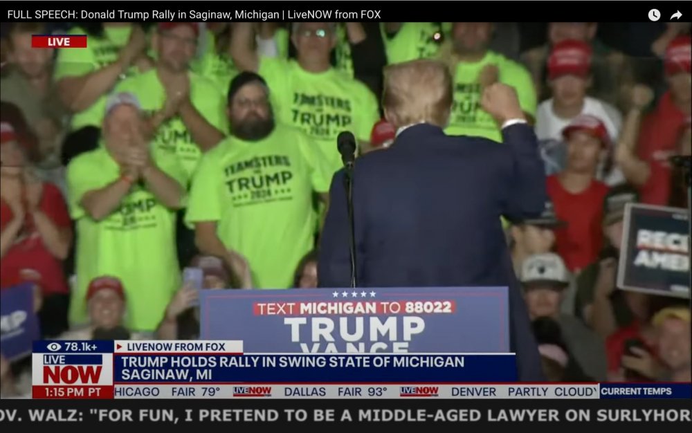 I noticed in the last couple of speeches, they've had Black people in the crowd behind him, but just skimming through the video, they spend most of their time looking down at their phones, only doing anything when people stand up (there's a Black guy behind Trump's left shoulder in a white/gray hoodie who seems to stay out of sight most of the time, but he's also looking at his phone). Did somebody say unions? That group in the obnoxious shirts behind him were Teamsters, and all of those obnoxious shirts are pulled over other clothes, making me wonder if they just handed them out at the rally12 points