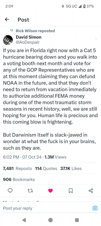 This morning, I got to enjoy some Leopards eating a dude's face. Old friend of mine who I'm still connected to on FB. Super conservative catholic, former Air Force meteorologist. He has gone full Trumpy/conspiracy theory -- plandemic, the jab, "they" can't be trusted, all that shit. But...he's still a trained meteorologist. So this morning, he posts about the absurd conspiracy theories that Hurricane Milton is government weather manipulation: "An airplane with a doohickey cannot make nor steer a hurricane. A lot of y’all need to get off the web and get your meds dialed in." Initially, some of his friends/followers chimed in, agreeing. But then, the critical mass of the insane conspiracy theory crowd he hangs with overwhelmed him: "you're wrong on this one....this tech has been around for decades" "Pretty shocking how unaware of this you are, actually." "https://www.tiktok.com/t/ZTFPHWvkj/ This guy goes over the same info but the way he summarizes it is interesting. Put that together with the plane seen flying for hours above that area and it has to make you wonder." "Clearly you’ve not researched anything. But you could also look up in the sky. It’s called called Geo Engineering, it’s a cocktail of Aluminum Nano Particulates, Barium and Strontium 7. It’s been going on since 1948. - The Patent office has all the patents listed. It’s public Information - CIA chief Brennan has admitted to it. - It’s now been banned in Tennessee and New Hampshire" "It took a minute but I don't agree with you on this one. I do think there is some weather engineering or other contributing factors going on in our world today. I do not believe it's all just an act of God." "There are also tons of these lines. I’ve watched a lot of hurricanes and never seen them. People are saying it’s because of electromagnetic waves. All this shit is plausible because we’re watching it." "Critical thinkers have eyes & brains. Programmed humans have neither." Some people chimed in "what about cloud seeding?" He explained in short form how the physics don't work when talking about a hurricane: "cloud seeding is to hurricanes as farts are to tornadoes." All to no avail. Just a CASCADE of people saying "nope, do your research." I gotta tell ya, I am now amused to watch an ACTUAL expert/trained scientist in the field explain how the laws of physics simply preclude any of the batshittery they're talking about (the amount of energy involved in a hurricane is more than any device can interfere with). Not so funny now, is it? Dumbass, getting hoisted on his own "we can't trust the science!" petard. Fuck em all.34 points