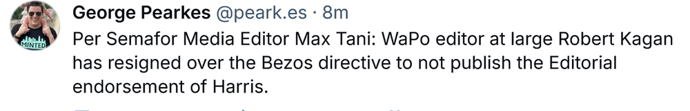 I'm not going to lie. The shit coming out right now almost indicates that the fourth estate understands the stakes. My main issue is that these idiots are a week late. 10-15% of the people who will vote have already voted. As an eternal optimist I'd like to believe that this shit is timed as well as they can muster. But fuck them for not beating this drum constantly, day in and day out, for years. Seriously. Even if you're a classical liberal (what conservatism used to mean), you know that the nation can easily withstand a Kamala Harris presidency and still move toward your preferred end state. The ultra-nationalism and ethnocentrism (white nationalism) represented by Trump is a direct threat to American ideals. Fuck these pussies for waiting until T minus 12 days to start flooding the national narrative with this shit.14 points