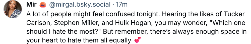I’ve said it many times. There are only 3 types of Trump supporters: 1) wealthy folks that will do anything to get more money, like Elon; 2) completely uninformed people who fell for all the propaganda, or just don’t pay attention, and that includes conservatives, religious right Christians who are basically hypocrites, and others who think he’s good for them when he’s just a crook, traitor, grifter, convict, etc; and 3) racists. He suddenly popped up with #3 to go with #2. It’s gotten to the point that given that, it’s become very difficult to show these people patience and niceness. After all, they are supporting a candidate who preaches hate and lies every time he opens his mouth and his followers now demonstrate the same behavior. At some point you have to ask the question, “why treat them with respect when they don’t practice it or earn it?” People accepting this behavior is what will destroy this country.14 points